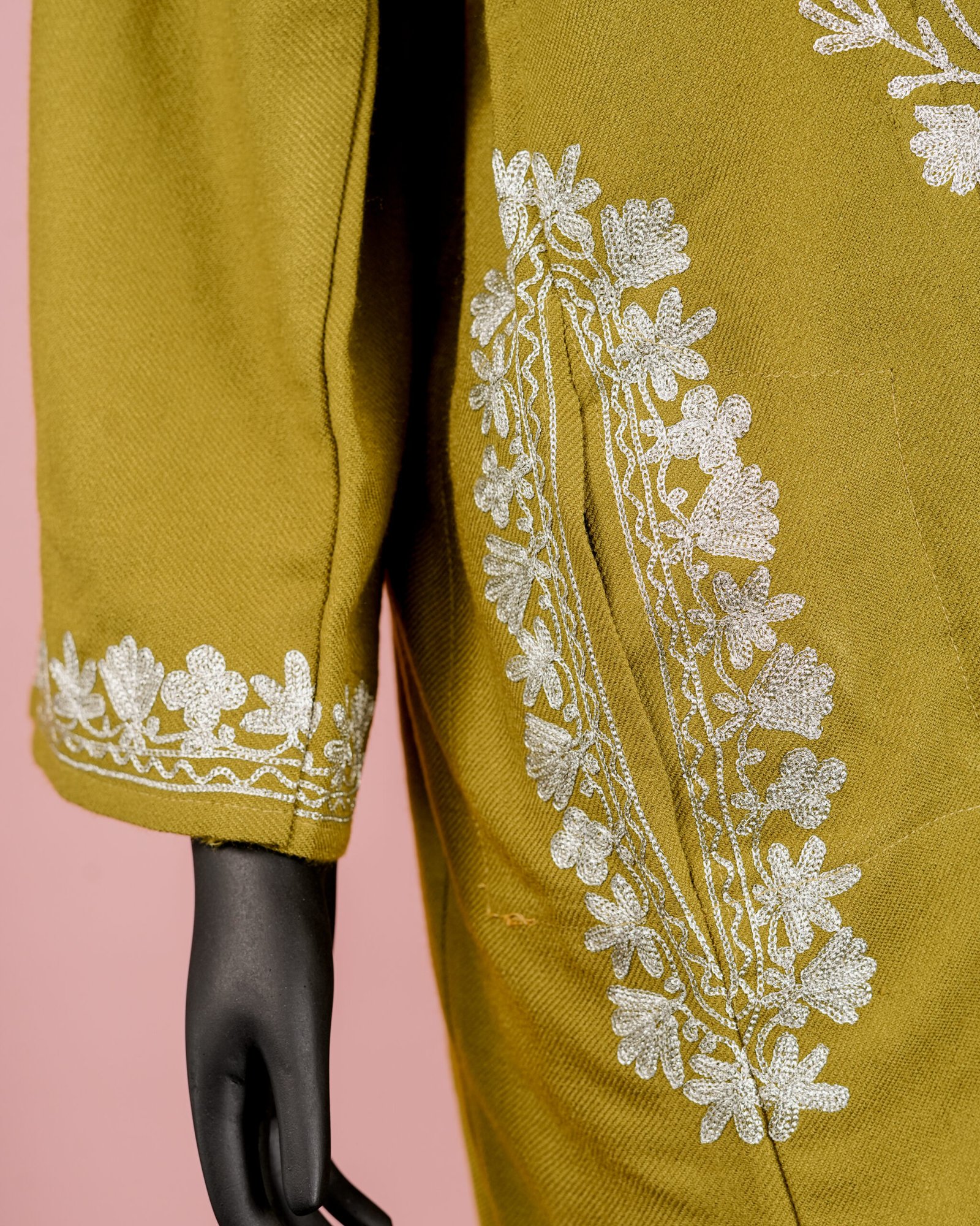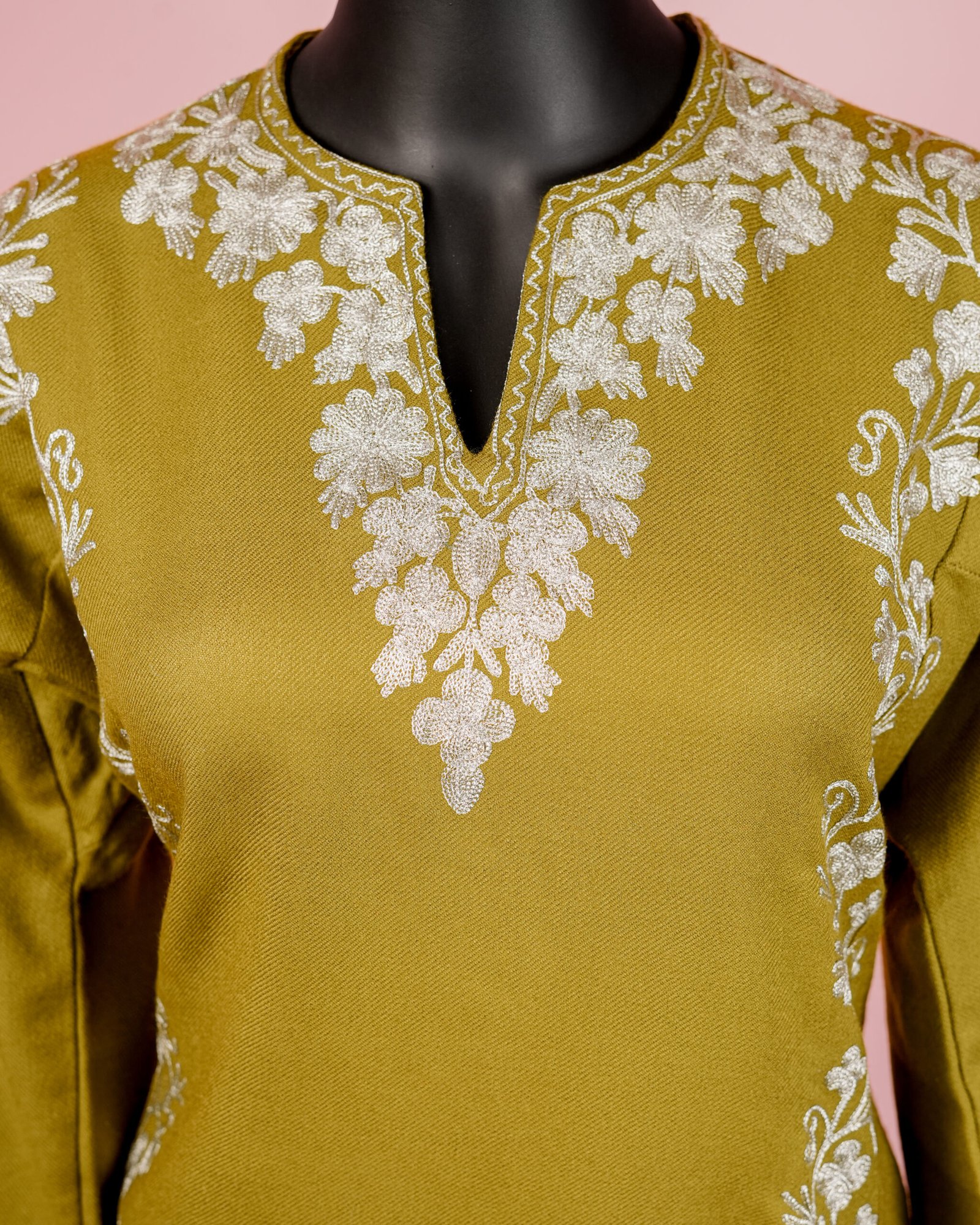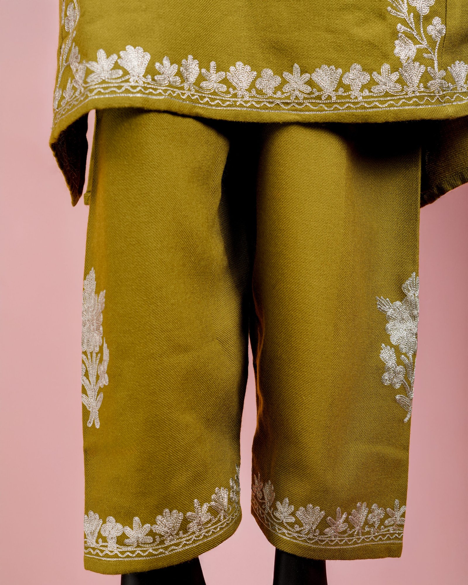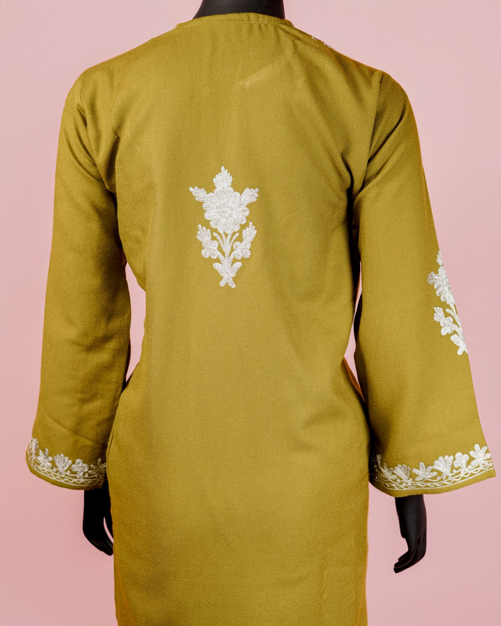 This elegant mehndi green ensemble includes a woolen Pheran style kurta and matching pants both beautifully crafted with zari embroidery.