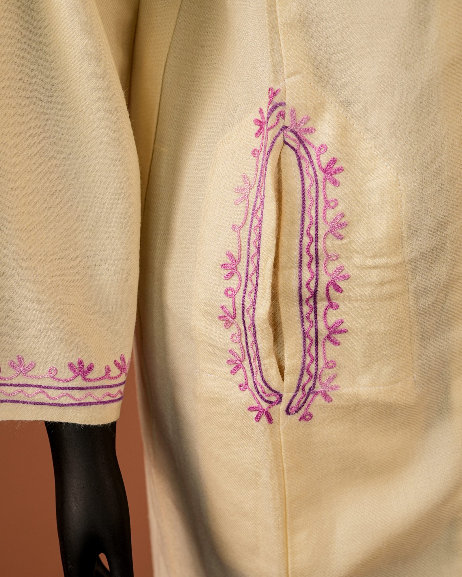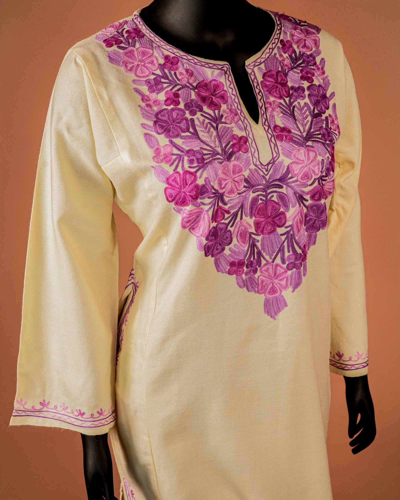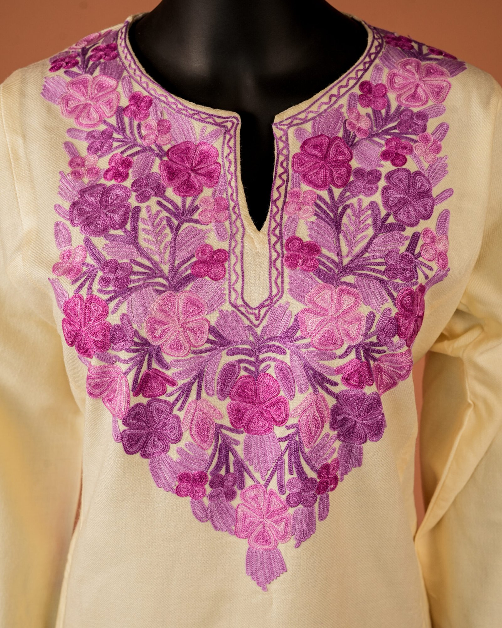This warm woolen Kashmiri Pheran featuring traditional embroidery offers a soft texture, elegant look and relaxed comfort fit.
